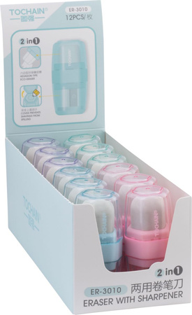 - Pojedyncza gumko-temperówka z pojemnikiemErgonomiczny sześciokątny kształt Nie zawiera ftalanów i lateksu Wymiary gumki: 31 x 18 mm Cztery pastelowe kolory obudowy 12 szt. w displayu