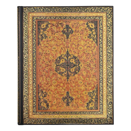 Notatnik posiada tłoczenia i elementy pokryte złotą folią oraz złote brzegi stron.