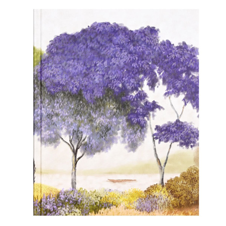 Okładka przedstawia fioletowe drzew w środku letniego dnia.