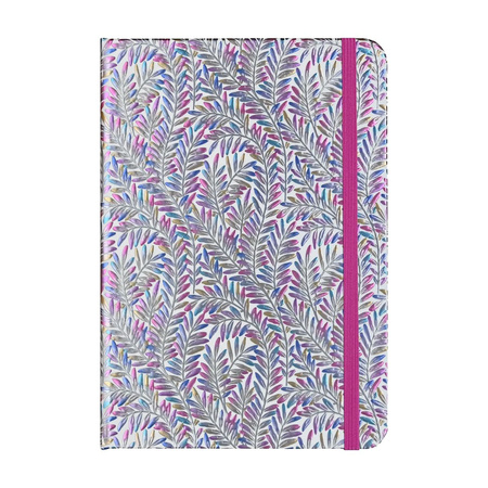 Notatnik posiada tłoczenia i opalizujące elementy, złote brzegi stron oraz dopasowane kolorystycznie zamknięcie na gumkę.