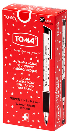 - Długopisy SUPERFINE TO-069 Długopisy automatyczne w plastikowej obudowie w gwiazdki w kolorze tuszu, trwała kulka z węglików spiekanych wolframu 0,5 mm, gumowany uchwyt w kolorze tuszu. WKŁAD - szwajcarska technologia Floating BallSystem