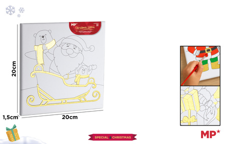 - Podobrazie do kolorowania. Wymiary całkowite: 20 × 20 cm, grubość 1,5cm.Rama z drewna sosnowego, 100% płótno bawełniane, 280 gr/m2.Łatwa do kolorowania powierzchnia z przyjazną dla środowiska powłoką. Wzór: Mikołaj i sanie.