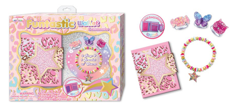 Portfel z przegródkami zapinany na rzep, bransoletka z zawieszką oraz 3 pierścionki to idealne połączenie dla małej miłośniczki mody i trendów.