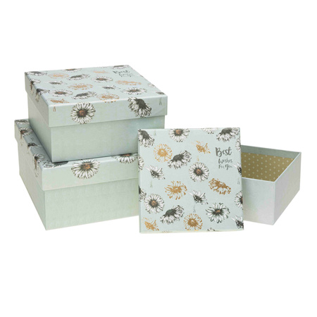 - Zestaw Pudełek Ozdobnych, Kształt kwadratowy, Kolor miętowy w kwiaty, Materiał: tektura, Zestaw 3 szt. Wymiary: S: 24*17*6.5, M: 26*19*8, L: 29*21*9