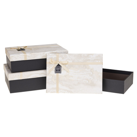- Zestaw Pudełek Ozdobnych, Kształt prostokątny, Wzór marmurkowy, Materiał: tektura, Zestaw zawiera 3 szt. Wymiary: S: 24*17*6,5, M: 26*19*8, L: 29*21*9