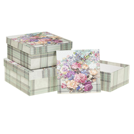 - Zestaw Pudełek Ozdobnych, Kształt kwadratowy, Wzór kwiatowy, Materiał: tektura, Zestaw 3 szt. Wymiary: S: 15.5*15.5*7.5, M: 18*18*8.5, L: 20*20*9.5