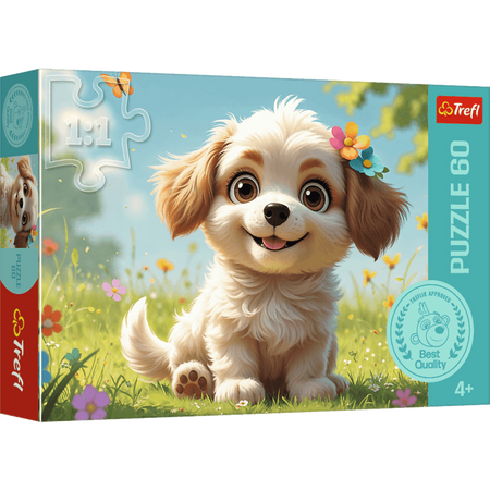 Szczeniaczkiem być! to puzzle składające się z 60 elementów, zaprojektowane z myślą o małych fanach zwierząt.