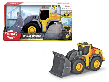 Dickie Toys Volvo spychacz ze światłem i dźwiękiem, 23 cm Spychacz z dużą łopatą to idealna zabawka dla początkujących budowniczych. Łopatę można podnieść oraz opuścić.