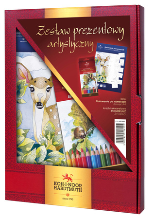 - W skład zestawu wchodzą: Malowanie po numerach oraz zestaw kredek akwarelowych Mondeluz 24 kolory.Zestaw prezentowy artystyczny spakowany w ozdobne, kartonowe pudełko